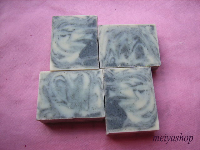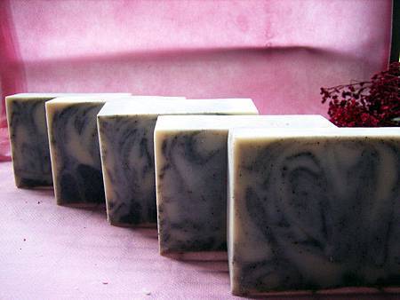 4/26氣溫23度 晴(4)成份 椰子油25/棕櫚油23/橄欖油50/雪白乳化油2/%香氛 薰衣草/精油添加 青黛粉第四次打皂,油鹼混合溫度約45度,打了4個10分鐘,加入薰衣草精油後已有濃湯的感覺,但還沒到trace的程度,入模時溫度約38度 一粒一粒是青黛粉